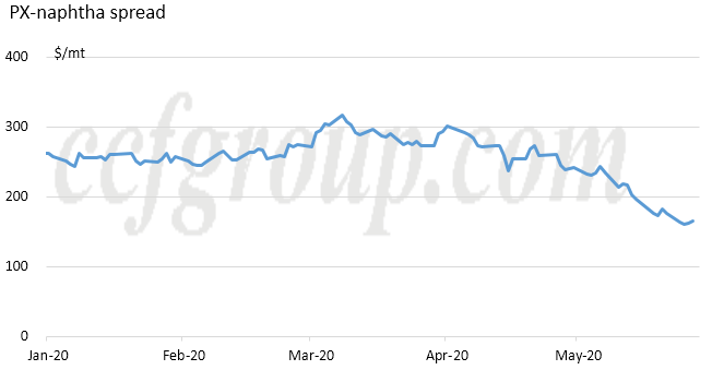 Se puede ver en el gráfico a continuación que a partir del día en que se cerró la planta PTA de Hanbang (20 de mayo), el diferencial PTA-PX se había ampliado obviamente, mientras que el diferencial PX-nafta había disminuido hasta alcanzar un mínimo histórico.