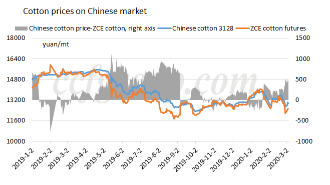 El contrato de algodón de ICE May ha estado disminuyendo constantemente la semana pasada, y el 27 de febrero, el contrato alcanzó la caída máxima a 62,47 centavos/libra. El mercado vuelve a entrar en pánico después de las primeras preocupaciones sobre el brote del nuevo coronavirus en China. En medio del pánico, el contrato de algodón de mayo de Zhengzhou también alcanzó el límite de bajada el 28 de febrero a 12.180 yuanes/tm. Del 24 de febrero al 2 de marzo, las ventas de algodón a pedido de las fábricas fueron relativamente activas debido a la fuerte disminución de los futuros del algodón, para reponer la materia prima.