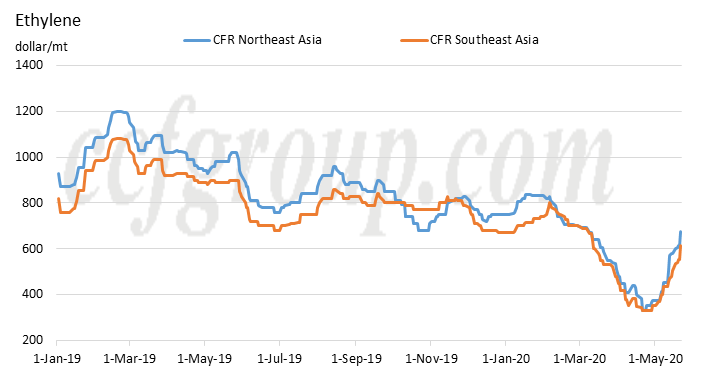En primer lugar, a medida que el petróleo crudo internacional sube, el mercado de productos químicos se ha visto respaldado. En la actualidad, los precios del petróleo WTI y Brent se han recuperado por encima de los 30 dólares por tonelada, lo que supone un apoyo a los costes para el mercado químico en general. La cadena general de la industria de las olefinas se recupera bien. En lo que respecta al monómero de etileno, su precio en el noreste de Asia ha aumentado de 330 $/t en abril a 675 $/t en la actualidad. El aumento del petróleo crudo y del etileno ha impulsado todo el mercado del PE y es evidente que el LLDPE también se ha visto afectado.