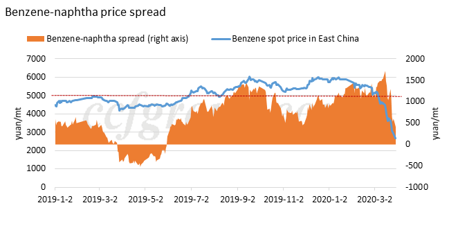 Como uno de los muchos productos químicos, el costo del benceno es difícil de calcular debido a sus complicadas técnicas de producción. En febrero de 2020, cuando casi todo el mercado de aromáticos cayó bruscamente, el mercado del benceno se había mantenido firmemente por encima de los 5.000 yuanes/tm. ¿Es por el alto costo? ¡Aparentemente no! Según el costo del precio de la nafta más $130/tm, el margen del benceno es el que se muestra a continuación, bastante bueno en marzo de 2020. ¿Se debe a la propia estructura de oferta y demanda del benceno? ¡Ciertamente tampoco! Como sus principales productos derivados, el monómero de estireno y el CPL, cayeron libremente y la producción también se redujo considerablemente, los fundamentos del mercado del benceno no eran de ninguna manera buenos.