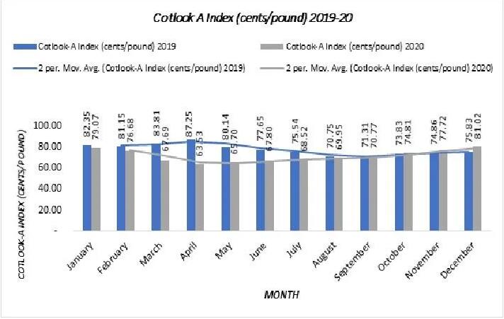 El Índice de Cotlook-A ha informado de una fuerte caída en los precios del algodón para 2020. Los precios cayeron a 63,53-81,02 centavos por libra en 2020 en comparación con los precios de 70,75-87,25 centavos por libra del año anterior. El índice se mantuvo entre 65,00 y 70,00 centavos por libra entre marzo y agosto de 2020 y alcanzó su nivel más bajo en abril con 63,53 centavos por libra.