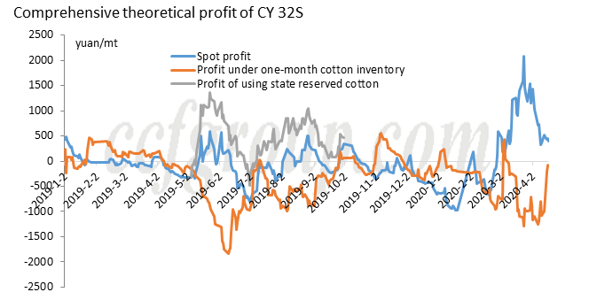 Anteriormente, las ganancias al contado de las fábricas de hilo de algodón parecían buenas, pero con las existencias de algodón de alto precio, las ganancias reales eran escasas y la mayoría de las fábricas sufrieron pérdidas con el inventario de algodón de un mes. El precio del hilo de algodón se desaceleró hasta descender en abril y las existencias de algodón de alto precio se consumieron, por lo que las ganancias reales de las fábricas de hilo de algodón se recuperaron gradualmente. Según CCFGroup, las fábricas de hilo de algodón pueden alcanzar el punto de equilibrio o disfrutar de ligeros beneficios en la actualidad.