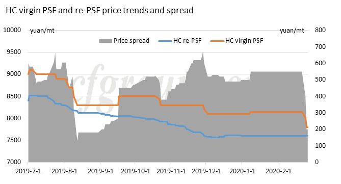 Por el contrario, el precio del HC re-PSF se mantuvo alto debido a la escasez de suministro de materia prima, y el diferencial de precios con el virgen se redujo rápidamente, por lo que el HC re-PSF se volvió mucho menos atractivo para los compradores.