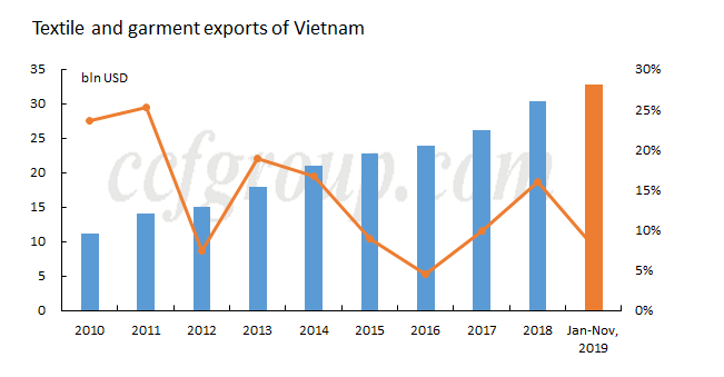 En 2019, Vietnam exportó 32.850 millones de dólares en textiles y prendas de vestir, un aumento interanual del 8%. Las importaciones de algodón totalizaron 1.451 millones de toneladas, una caída del 7,4% interanual, y las importaciones de tejidos fueron de 13.270 millones de dólares, un aumento interanual del 3,9%. Durante todo el año, la estructura de las importaciones de algodón ha cambiado en comparación con 2018. La proporción de importaciones de algodón brasileño ascendió al segundo lugar.