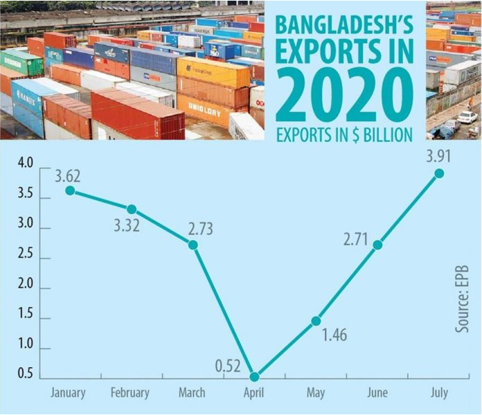 Los ingresos por exportaciones de Bangladesh en julio de 2019 ascendieron a 3.880 millones de dólares y a 3.910 millones de dólares en julio de este año, según datos proporcionados por la Oficina de Promoción de Exportaciones (EPB) del país. Este julio también supone una exportación de aproximadamente un 44% más que en junio de 2019.