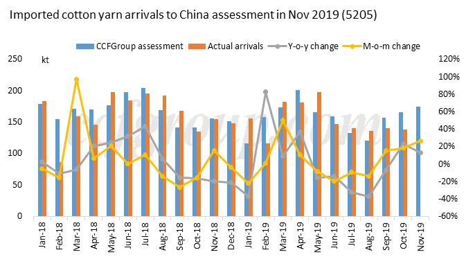 Las importaciones de hilo de algodón a China en noviembre se estiman en 175 mil, un aumento interanual del 13,23% y un aumento intermensual del 26,84%. Como la demanda de hilo de algodón importado fue tolerable en septiembre-octubre y el precio del dólar estadounidense y el tipo de cambio proporcionaron cierto margen de maniobra para los comerciantes, el aumento de las importaciones de hilo de algodón en noviembre cumplió con las expectativas. Teniendo en cuenta que algunos hilados de algodón paquistaníes no se calculan en los datos de la aduana, las importaciones de hilados de algodón mostradas por las aduanas pueden ser 25 kt menos que las importaciones reales, y las importaciones de hilados de algodón de las aduanas de China se prevén en aproximadamente 15 kt.