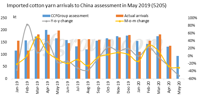 Las llegadas de hilo de algodón importado a China en mayo de 2020 se estiman en 94.000 millones, un 53,51% interanual y un 30,78% intermensual. Después del estallido de la pandemia de coronavirus, los comerciantes cancelaron los pedidos de hilo de algodón indio y paquistaní y redujeron los pedidos de hilo de algodón vietnamita, por lo que las llegadas de mayo disminuyen evidentemente.