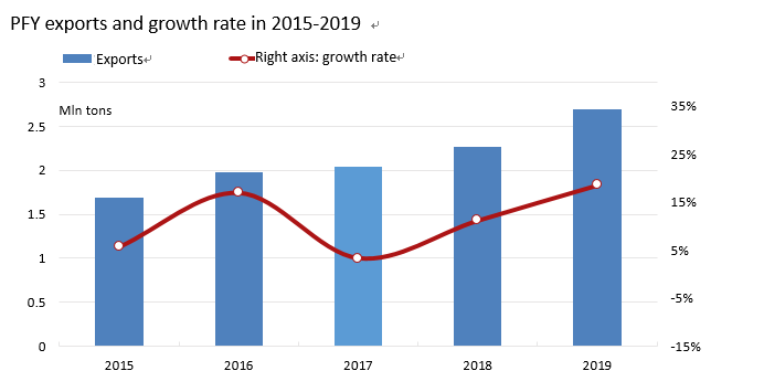 Las exportaciones de PFY aparentemente aumentaron con un mayor énfasis en la exportación en las plantas nacionales de PFY y se intensificó el problema de capacidad excesiva. En el caso de la débil demanda interna en 2019, las fábricas tradicionales aliviaron la presión de los inventarios aumentando las exportaciones, pero sujeta a la recesión económica mundial, la demanda del mercado extranjero tampoco fue optimista y la competencia en el mercado fue feroz. Por lo tanto, el precio de exportación se estaba reduciendo y las plantas de PFY redujeron el precio para la promoción, lo que aparentemente aumentó el volumen de exportación.
