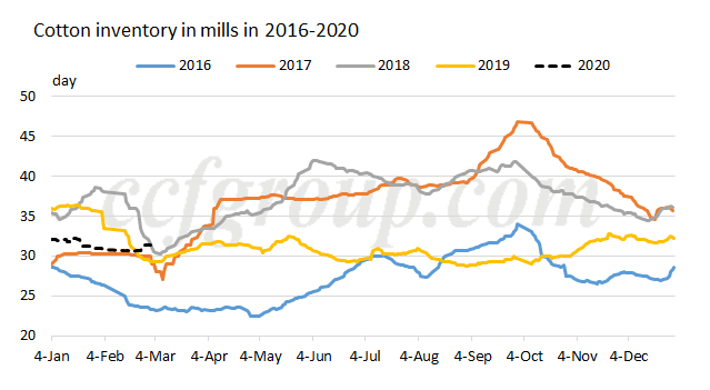 La mayoría de las fábricas reabastecieron materia prima la semana pasada cuando el mercado de futuros del algodón cayó y la disposición de compra se debilitó esta semana. Según CCFGroup, el inventario de algodón en las fábricas medianas y grandes es de 40 a 60 días, y el de las fábricas medianas es de 25 a 35 días. Se supone que el inventario de algodón en 2020 será relativamente bajo en comparación con años anteriores. Además, afectada por el nuevo coronavirus, la demanda transformadora se debilita un poco y el ritmo de consumo de algodón es lento. Actualmente, Mills considera principalmente dos factores que frenarán las compras esta semana. Una es que la mayoría de las fábricas reabastecieron la materia prima la semana pasada. Otra es que algunas fábricas esperan que los futuros del algodón de la ZCE se recuperen en marzo y consideran comprar algodón a bajo nivel.