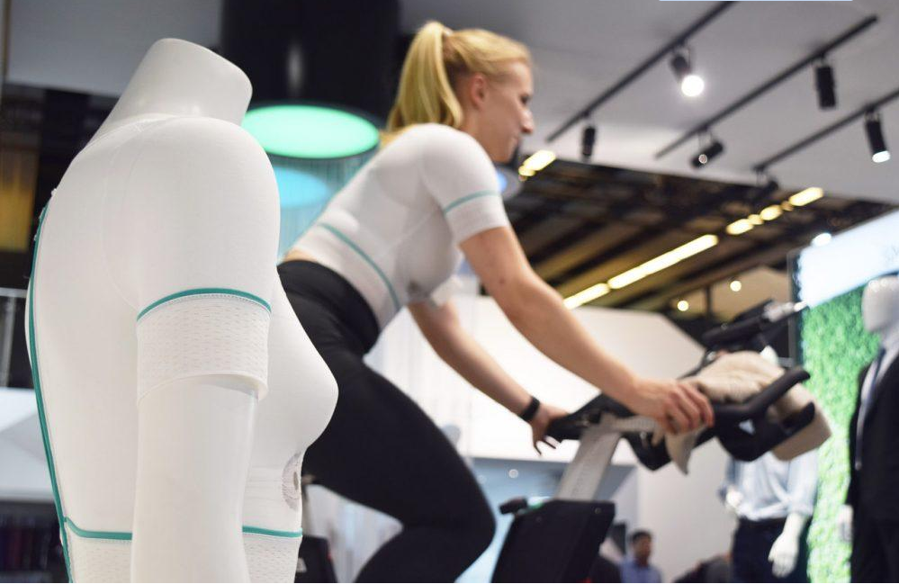 En la primera etapa del trabajo de desarrollo se fabricaron cómodas esposas para el control remoto de robots y estaciones de carga textiles para la carga inductiva de teléfonos inteligentes. En un proyecto posterior se produjo una camiseta inteligente con funciones de medición. Esta prenda funcional demostró eficazmente las posibilidades que ofrece TEXTILE-CIRCUIT a una amplia audiencia en ITMA 2019. Mide la frecuencia cardíaca, los niveles de humedad en el textil y la temperatura de la piel. Los sensores necesarios para ello se integran en un solo paso en el tejido y transmiten sus señales registradas a través de un conductor aislado para su procesamiento en una unidad electrónica móvil. Los resultados se pueden consultar en dispositivos móviles a través de Bluetooth. Los valores medidos para un ciclista se mostraron de forma impresionante en una enorme pantalla en la ITMA 2019. Esta camiseta inteligente, además de ofrecer funcionalidad, también proporciona una comodidad de uso excepcional. La flexibilidad de las superficies conductoras y la bielasticidad de los tejidos brindan una libertad de movimiento excepcional, y los hilos de filamentos de poliamida texturizados procesados brindan un tacto suave.