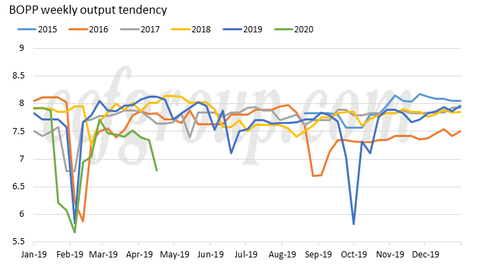 Aunque la mayoría de las fábricas de películas hacen todo lo posible para mantener los precios firmes, la demanda de BOPP se ha debilitado desde abril. Además, debido a los débiles pedidos de exportación y la limitada demanda interna, la mayoría de las plantas de películas han retenido inventario. Aunque algunos comerciantes procuran reponer sus existencias bajo el estímulo de un precio más alto, los nuevos pedidos todavía están limitados por el precio alto. Algunas plantas han sido cerradas en el período anterior y, a medida que las ganancias se reducen evidentemente, es posible que más y más plantas cierren en el mercado tardío.