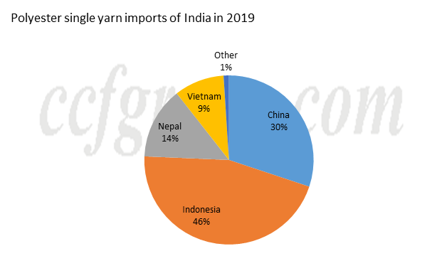 Si se analizan las importaciones de hilos simples de poliéster de la India, totalizaron 64 kt en 2019, con un 46 % de Indonesia y un 30 % de China. Sin embargo, las importaciones procedentes de los países involucrados en la investigación (China, Indonesia, Vietnam y Nepal) representaron el 99% del total de las importaciones de hilados sencillos de poliéster de la India, que cubrían casi todas las importaciones de hilados sencillos de poliéster.