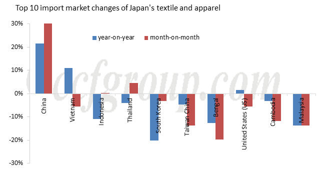 La principal fuente de importación de textiles y prendas de vestir de Japón experimentó cambios importantes en abril año tras año y mes a mes. Entre ellos, las importaciones procedentes de China aumentaron marcadamente año tras año y mes tras mes.