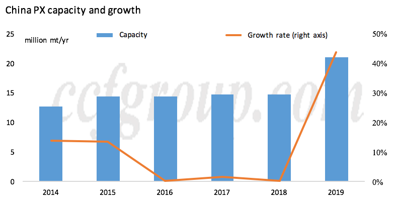 La tasa de crecimiento de la capacidad de PX de China se aceleró al 44 % en 2019. Desde principios de 2019, la capacidad de PX recién iniciada ha ascendido a 10,40 millones de toneladas anuales en China (incluida la nueva capacidad de Zhejiang Petrochemical). Mientras tanto, la dependencia de China de las importaciones de PX se había reducido al 50% en 2019.