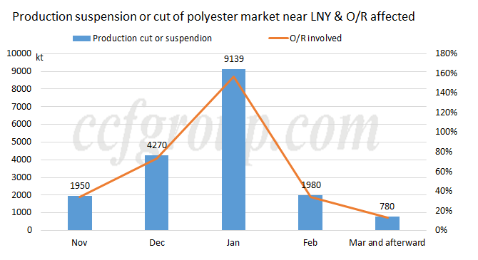 Al 17 de enero, la capacidad total prevista para cerrar o reducir la producción de las plantas de poliéster ascendía a alrededor de 9,14 millones de toneladas/año en enero, lo que representa alrededor del 15,67%, y alrededor de 1,98 millones de toneladas/año en febrero (un 3,4%). Así, la capacidad agregada involucrada estuvo cerca de 15,53 millones de toneladas/año en diciembre-febrero, compartiendo el 26,6% del total. El cambio es intenso en enero y se espera que la tasa más baja de polimerización de poliéster cerca de las vacaciones del Festival de Primavera aparezca a finales de enero.