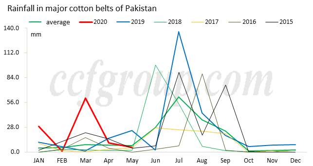 Según las precipitaciones de años anteriores en las principales zonas productoras de algodón de Pakistán, como Sangal, Bahavarnagar y Rahim Yar Khan, las precipitaciones fueron relativamente buenas en los primeros cinco meses de este año, lo que puede ser beneficioso para la plantación y el crecimiento del algodón. pero las lluvias monzónicas pueden llegar hasta julio. Actualmente, la plantación de algodón ha completado el 80% y el impacto de las langostas en el algodón paquistaní podría notarse más adelante.