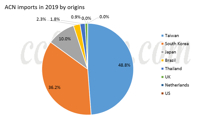 El gráfico y la figura muestran el volumen y la proporción de las importaciones en 2019, y se puede ver que la proporción de importaciones de ACN de Japón y Corea del Sur es relativamente alta y representa la mayoría de las importaciones anuales. Por un lado, esto se debe a la corta distancia y al rápido transporte. Por otro lado, está relacionado con el contrato de importación de ABS.