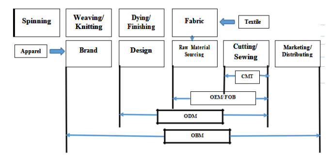 OBM = Fabricación de marca original, ODM = Fabricación de diseño original, OEM/FOB = Fabricación de equipo original/Free On Board, CMT = Corte, fabricación, ajuste Fig: Principales modos de producción [2]