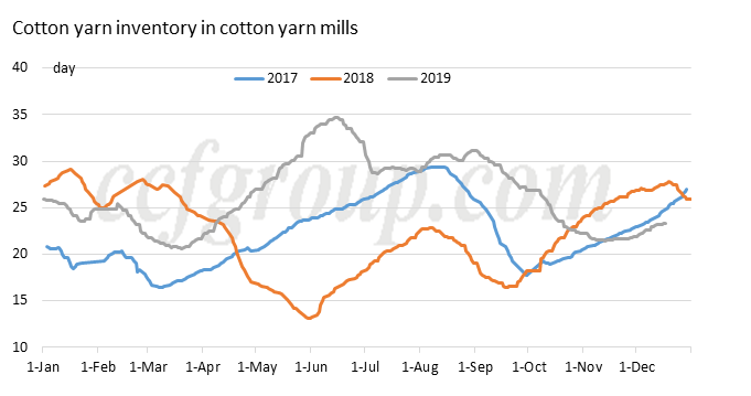 De la comparación del inventario de los últimos tres años, el inventario actual de las fábricas de hilo de algodón es mucho menor que el del año pasado. Está aumentando lentamente y es posible que no aumente obviamente para finales de diciembre.