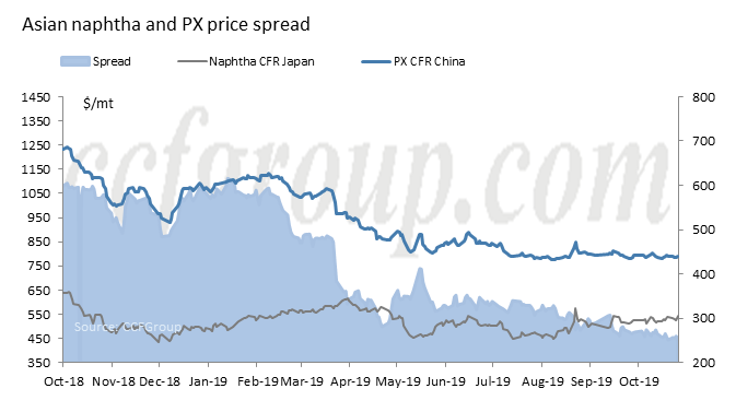 Parece que fue la nafta más firme la que aplastó la dispersión de nafta PX. En noviembre, el precio de la nafta aumentó casi un 10%, mientras que el precio del PX se mantuvo prácticamente estable. Sin embargo, si echamos un vistazo más profundo, fue la oferta prolongada de PX lo que disuadió a que el precio del PX subiera junto con la nafta como materia prima.