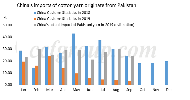 Según datos de aduanas, las importaciones de hilo de algodón de China procedentes de Pakistán alcanzaron los 97,5 mil millones, un descenso interanual del 60%. Según los estudios de mercado, este no fue el caso. Un gran número de las importaciones chinas de hilo de algodón procedentes del Pakistán no quedaron registradas en el sistema estadístico debido a problemas de calibre estadístico de los datos aduaneros. Se estimó que las importaciones chinas de hilo de algodón originario de Pakistán representaron 240 mil en enero-septiembre de 2019, un descenso interanual del 10,5%.