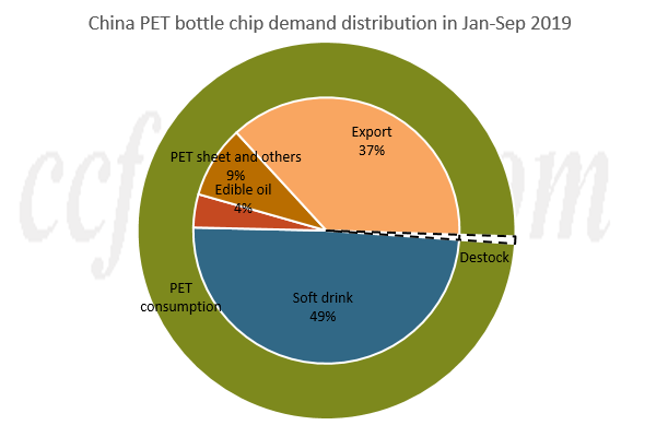 La demanda de chips de botellas de PET ascendió a 4,24 millones de toneladas en enero-septiembre de 2019, un crecimiento interanual del 5%, un poco más lento que el año pasado. Los refrescos siguen teniendo la parte dominante, ya que representan el 79% de la demanda interna de China. La demanda de PET de aceite comestible aumenta un 1% interanual, mientras que la demanda de láminas de PET y otros tipos de PET crece rápidamente entre un 14% y un 15% interanual en enero-septiembre de 2019, lo que proviene principalmente de la demanda de envases de gama baja-media. Algunas plantas de láminas de PET que producen especificaciones de alta gama no funcionaron bien en 2019. Además, la entrada de pedidos de exportación fue decente en el primer semestre de 2019. El volumen de exportación de enero a septiembre ascendió a 2,55 millones de toneladas, preservando un crecimiento interanual del 18%. En general, el mercado de chips de botellas de PET se encuentra en un modesto proceso de liquidación de existencias en el primer y tercer trimestre de 2019. La oferta apenas se ve afectada debido al retraso de las nuevas empresas. En el cuarto trimestre, a medida que aumente la nueva capacidad y la demanda se estabilice, el mercado de chips de botellas de PET puede enfrentar cierta presión.