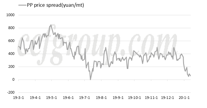 La semana pasada, el precio del propileno subió drásticamente, de 6600 yuanes/tm a principios de 2020 a los 6900-6950 yuanes/tm actuales, básicamente aumentando 50 yuanes/tm por día. Las razones fueron las siguientes: 1. Varias plantas de PDH (como Tianjin Bohua, Shaoxing Sanyuan, Hebei Haiwei, etc.) cerraron y el suministro de propileno disminuyó; 2. Las ganancias downstream fueron buenas en la etapa anterior, las plantas funcionaban a un alto ritmo operativo y la demanda era buena; 3. El petróleo crudo internacional subió continuamente debido a las tensiones geopolíticas; etcétera. En cuanto al PP en polvo, el aumento del precio del propileno significó el aumento de los costes de producción. Como puede verse en la imagen anterior, el flujo de caja teórico actual de las empresas de pólvora era de aproximadamente -50-(-) 150 yuanes/tm.