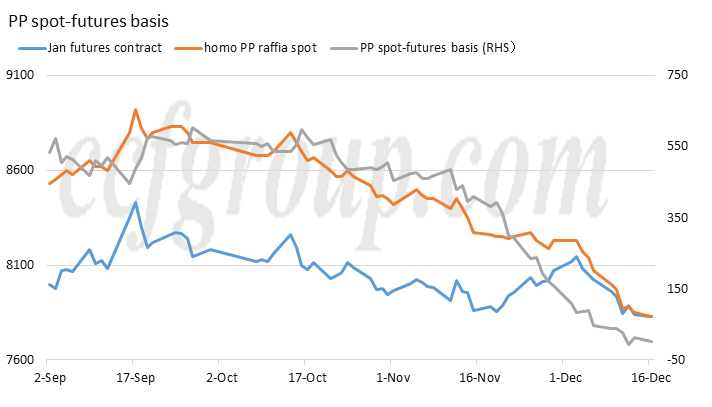 La base de los futuros al contado del PP se redujo continuamente desde principios de noviembre, y el precio al contado actual era casi igual e incluso descontado con los futuros. Se debió principalmente a la continua debilidad del mercado al contado. Los futuros del PP se habían recuperado 350 yuanes desde finales de noviembre hasta principios de diciembre, mientras que el precio al contado sólo subió 50 yuanes. Y cuando los futuros del PP cayeron, el precio al contado cayó más pronunciadamente. La base de los futuros al contado del PP se había reducido alrededor de 500 yuanes en sólo un mes.