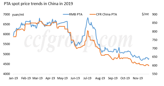 En 2019, los precios del PTA cayeron de 6.000 yuanes/tm a principios de año a alrededor de 4.900 yuanes/tm a finales de año, una disminución del 18,3%. En la primera mitad del año, con la recuperación económica y el mantenimiento de las plantas, los precios del PTA aumentaron de alrededor de 6.000 yuanes/tm a principios de enero a 6.800 yuanes/tm en abril; el mercado en mayo-junio mostró una tendencia en forma de V. El mercado de PTA cayó brevemente en mayo debido al reinicio de algunas unidades y al debilitamiento de la demanda. En junio, los precios del PTA aumentaron hasta 6.800 yuanes/tm con la publicación de buenas noticias sobre las conversaciones comerciales entre China y Estados Unidos y la adquisición de plantas transformadoras. Sin embargo, los precios del PTA cayeron lentamente a 5.000 yuanes/tm a partir de julio debido a la escasa demanda de las terminales y las expectativas de expansión de la oferta.