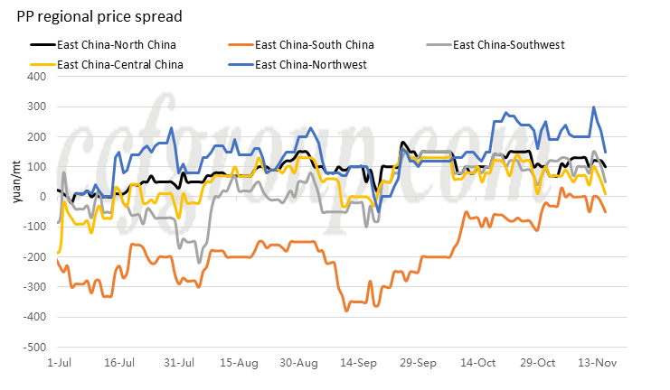 El precio al contado en el este de China sube en comparación con otras regiones después del feriado del Día Nacional bajo la influencia del cambio de rumbo de Ningbo Fortune y el mantenimiento frecuentemente corto de Zhongan Lianhe. En el sur de China, el precio al contado alguna vez fue más alto que el precio en el este de China. Sin embargo, como Grand Resource (Juzhenyuan) lo puse en producción, ahora el precio al contado en el sur de China tiene un descuento con respecto al precio en el este de China. Además, el alto precio en Ningbo, Jinhua y otras áreas recientemente ha atraído algunas fuentes de arbitraje interregional en las áreas del noroeste.