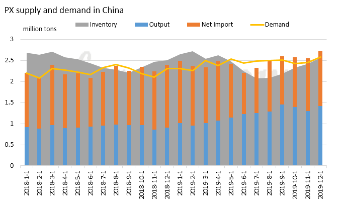 En el gráfico del equilibrio de oferta y demanda de PX en China, después de la reducción de inventario desde febrero, el inventario se reconstruyó en septiembre, cuando las nuevas plantas de PX liberaron producción mientras que varias plantas de PTA se cerraron no programadas debido a problemas económicos. Se espera que la relación inventario-consumo de PX se recupere a 1 mes a finales de 2019.