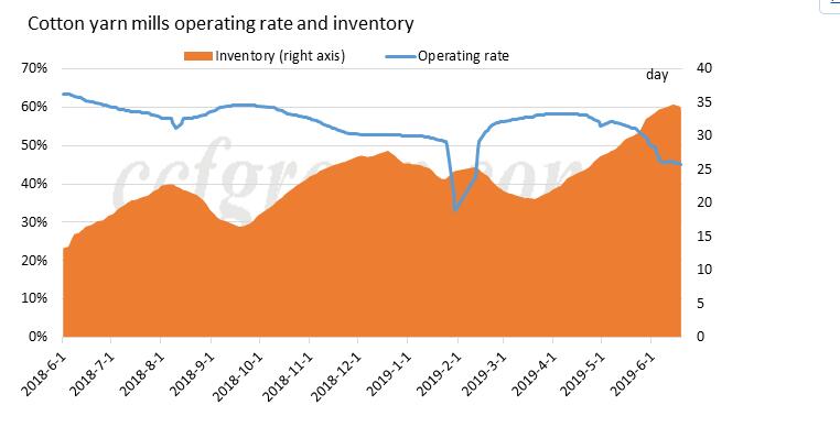 Según el gráfico anterior, el inventario de las fábricas de hilo de algodón disminuyó recientemente debido a una tasa de operación mucho más baja (45%) que el promedio del año anterior. Muchas plantas pequeñas cerraron y las plantas medianas y grandes redujeron la producción. Por otra parte, las preocupaciones en el sector downstream se ven aliviadas por el cese de la caída de los futuros del algodón de la ZCE. Además, las fábricas de hilo de algodón se dedican a la reducción de existencias, lo que también favorece las ventas.
